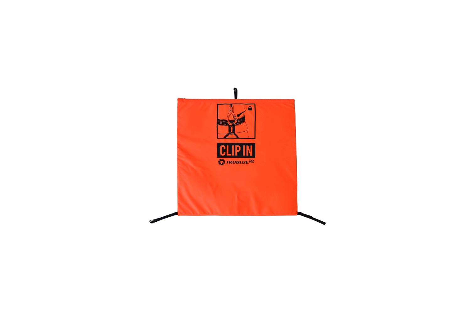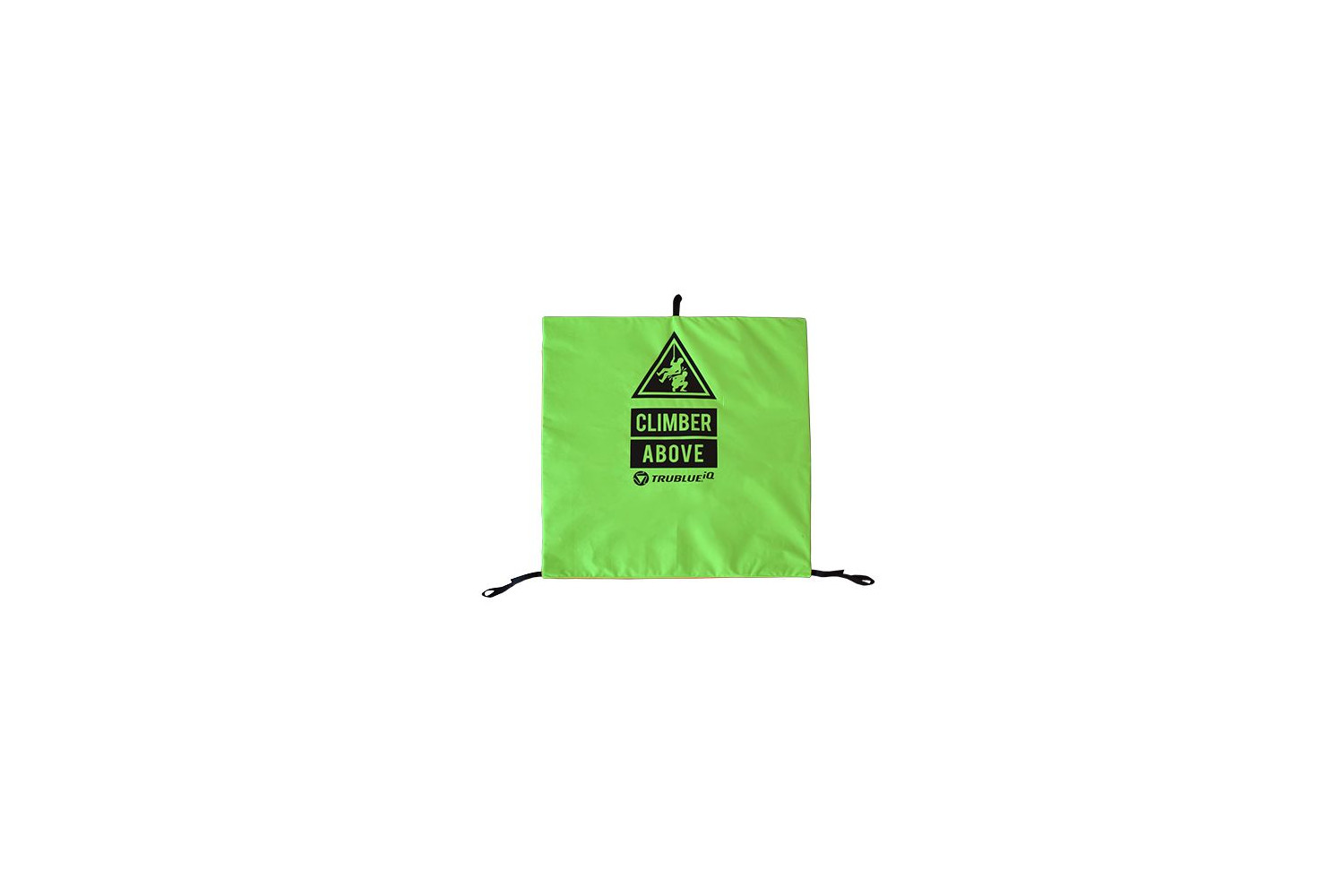 Un marquage extérieur « CLIP IN » en caractères gras, accompagné d’instructions graphiques, rappelle la procédure de fixation du mousqueton au harnais. Pendant l’escalade, la toile reste visible au sol, avertissant les autres grimpeurs de la présence d’un grimpeur en hauteur grâce à la mention « CLIMBER ABOVE » et à un pictogramme explicite imprimé à l’intérieur.