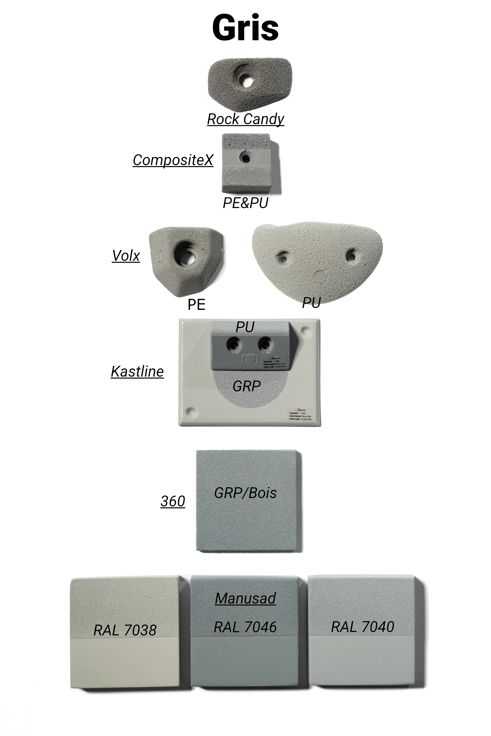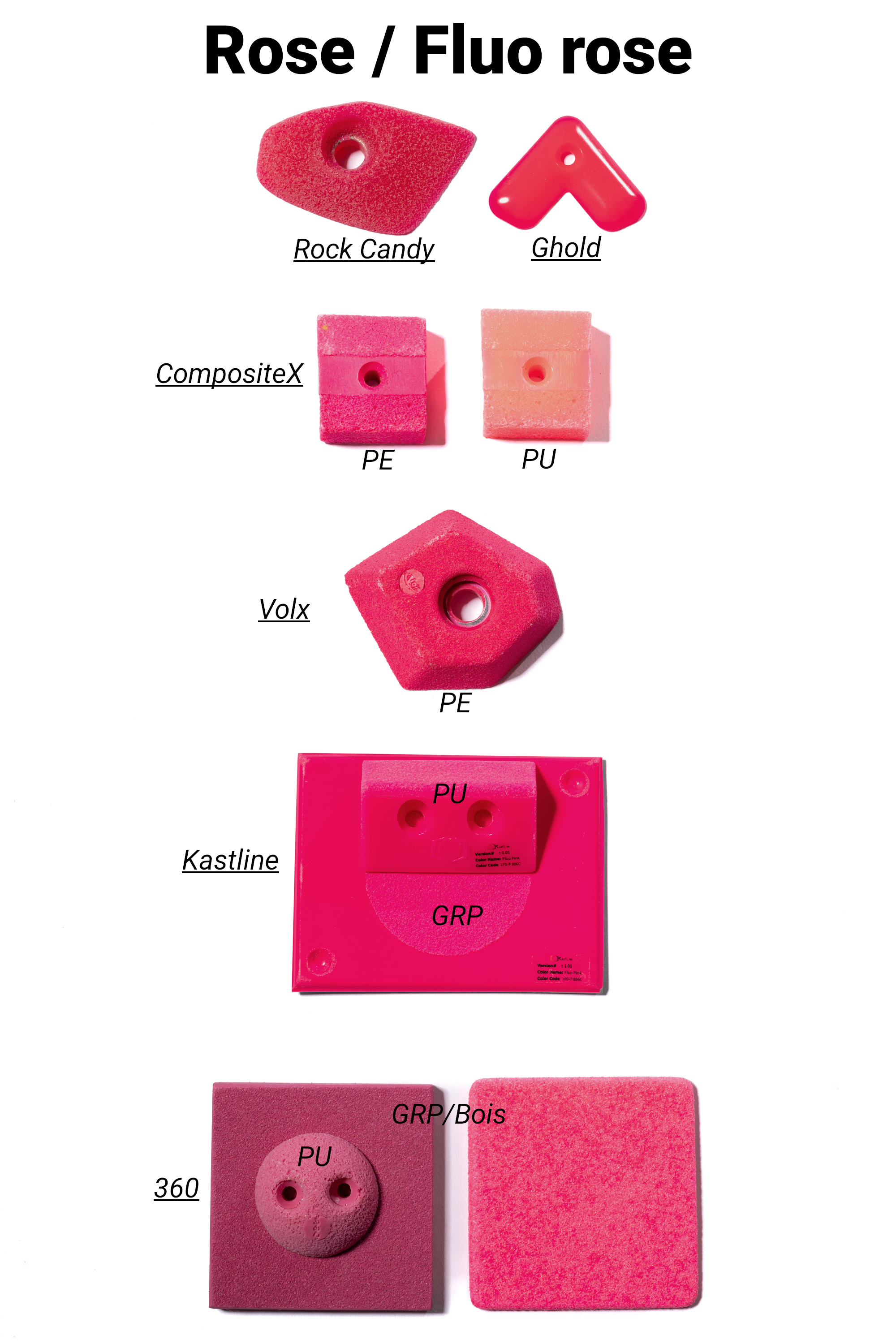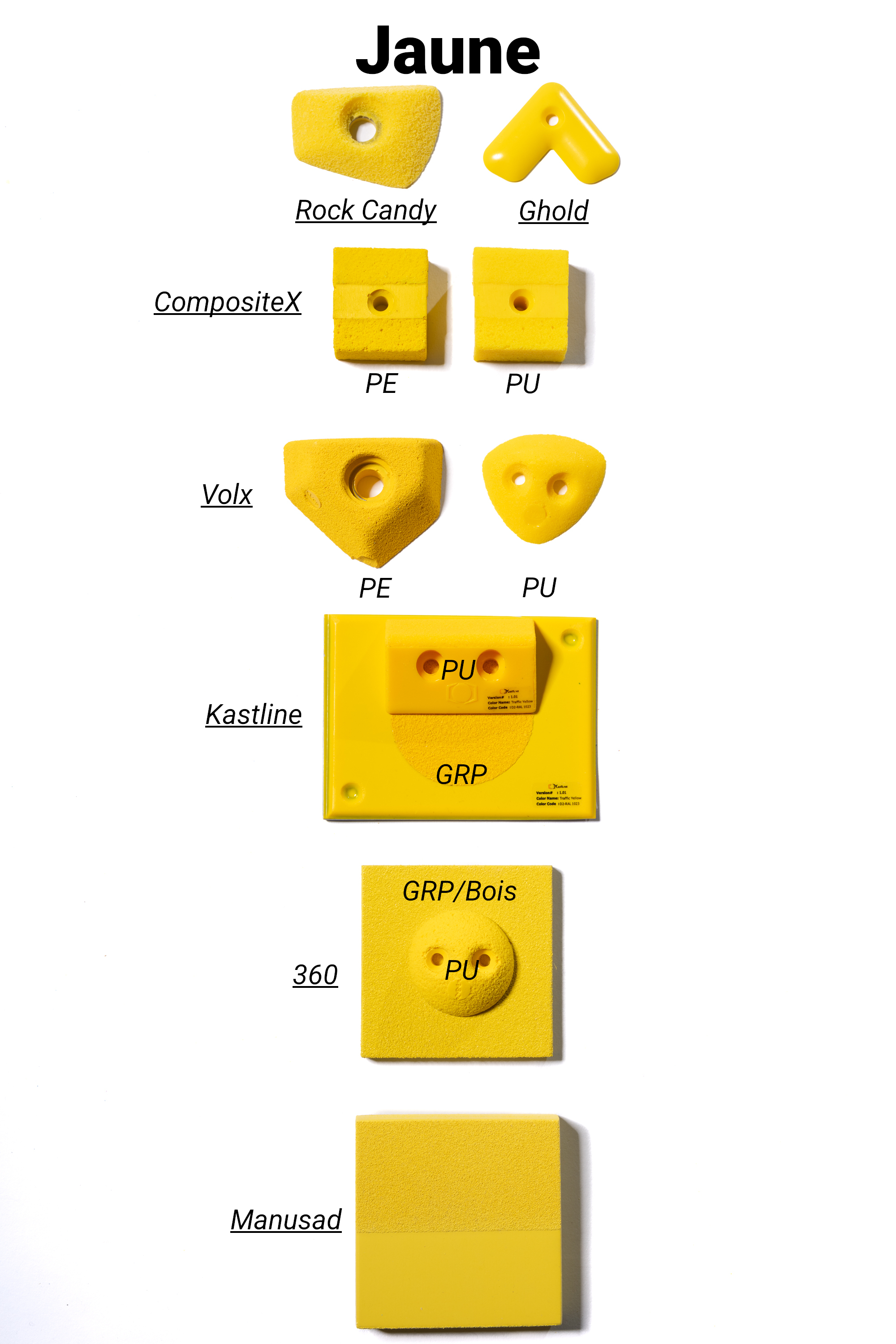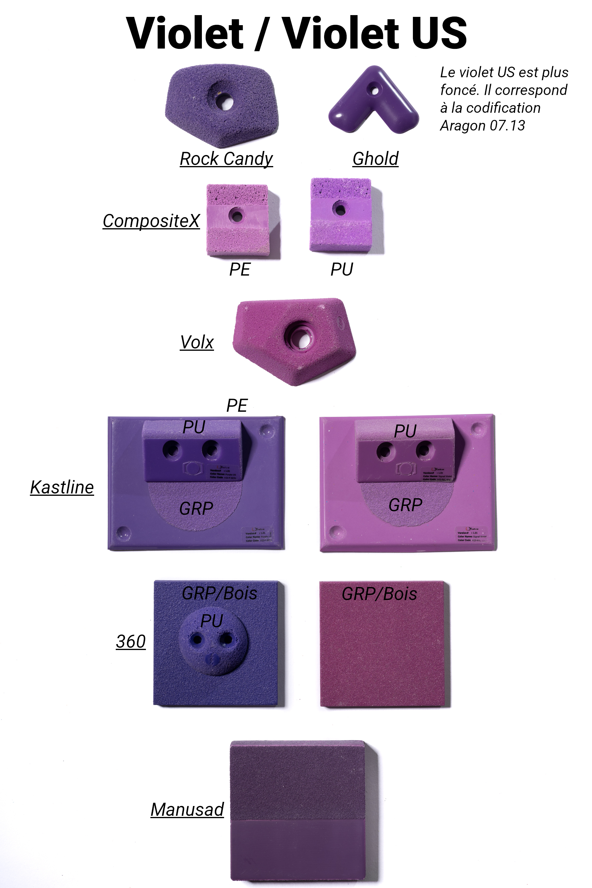 Les marques de prises et volumes d'escalade ont uniformisé leurs gammes de couleurs à la demande des salles qui cherchent à faire des itinéraires par couleur.