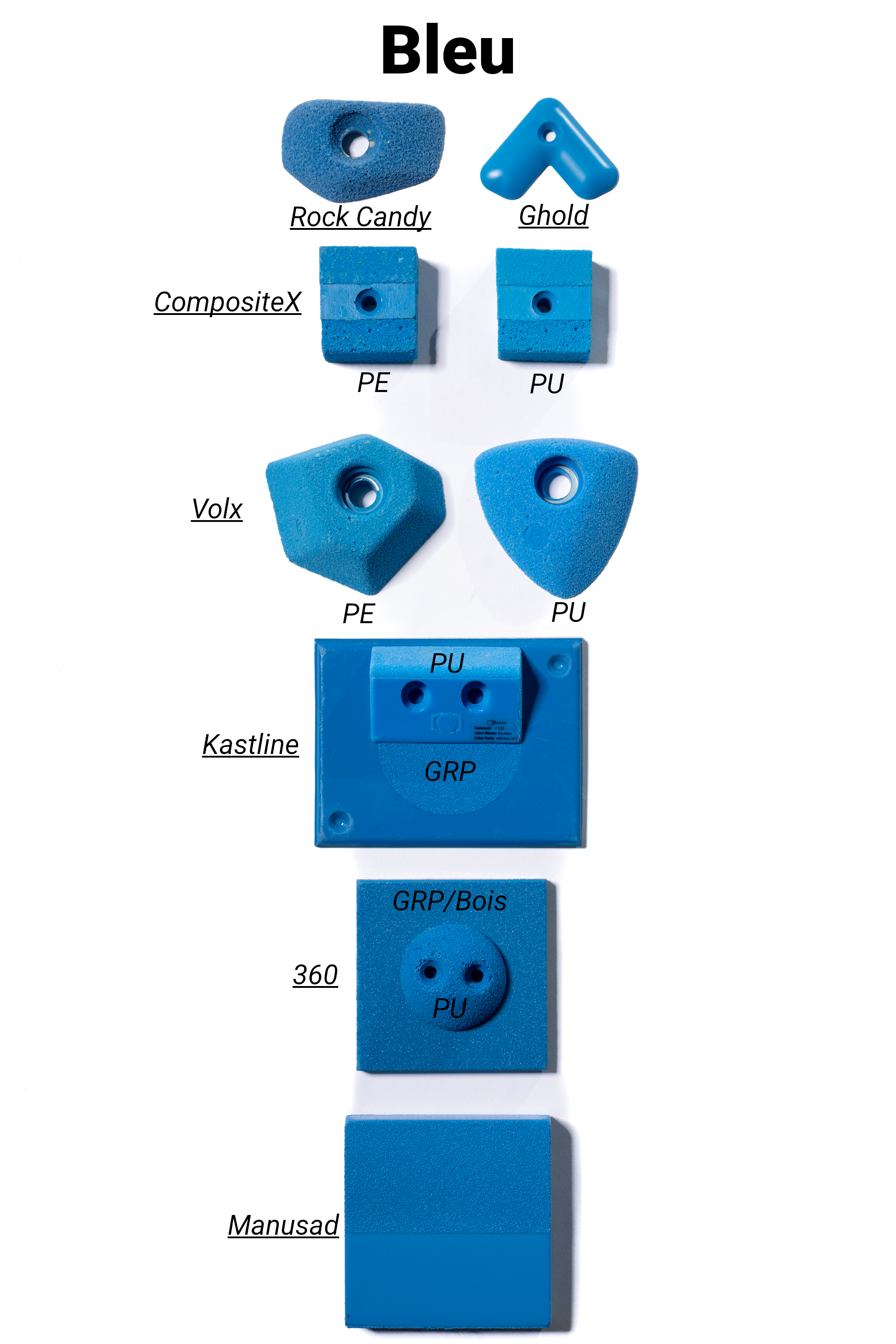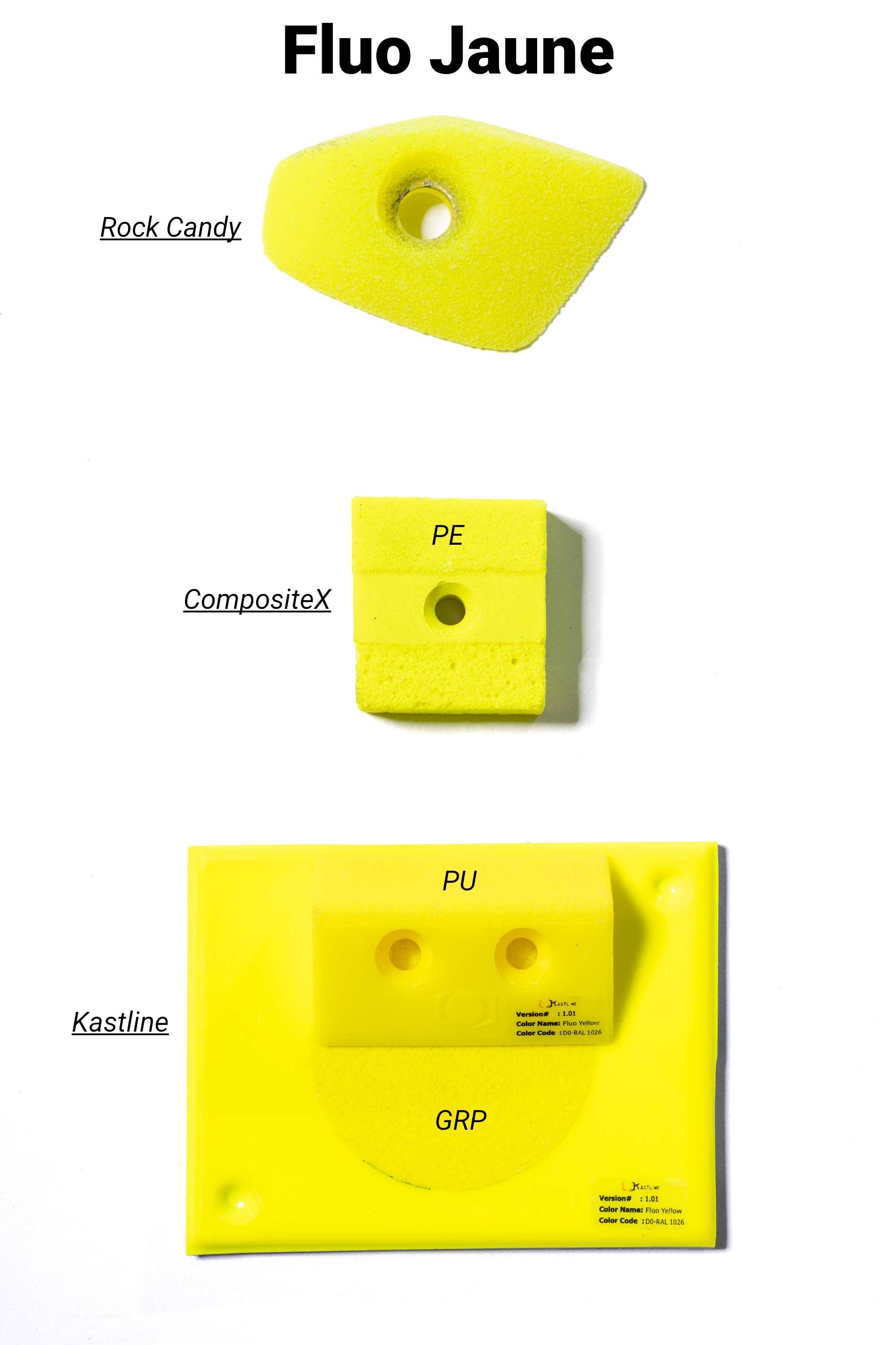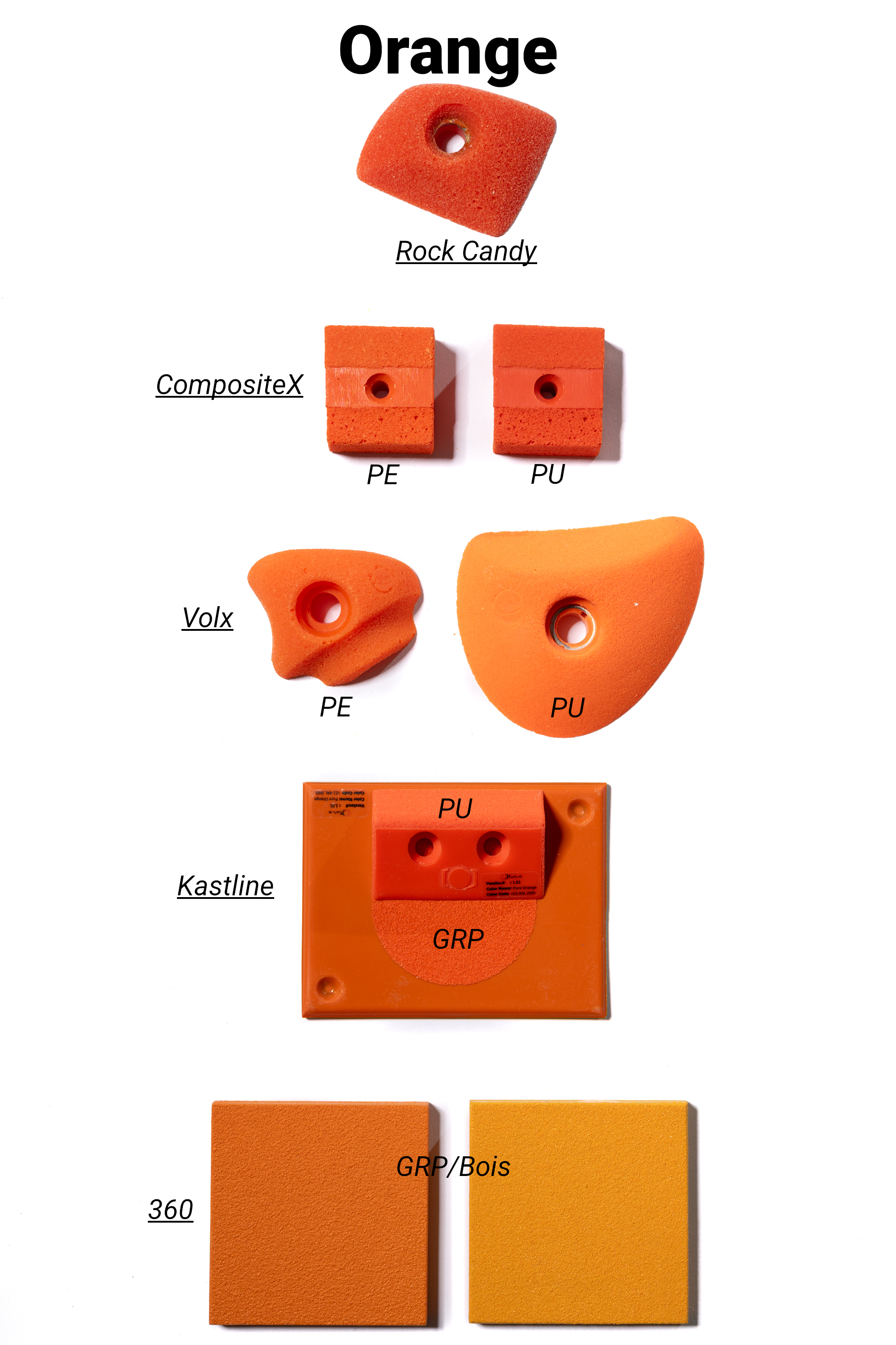 Les marques de prises et volumes d'escalade ont uniformisé leurs gammes de couleurs à la demande des salles qui cherchent à faire des itinéraires par couleur.
