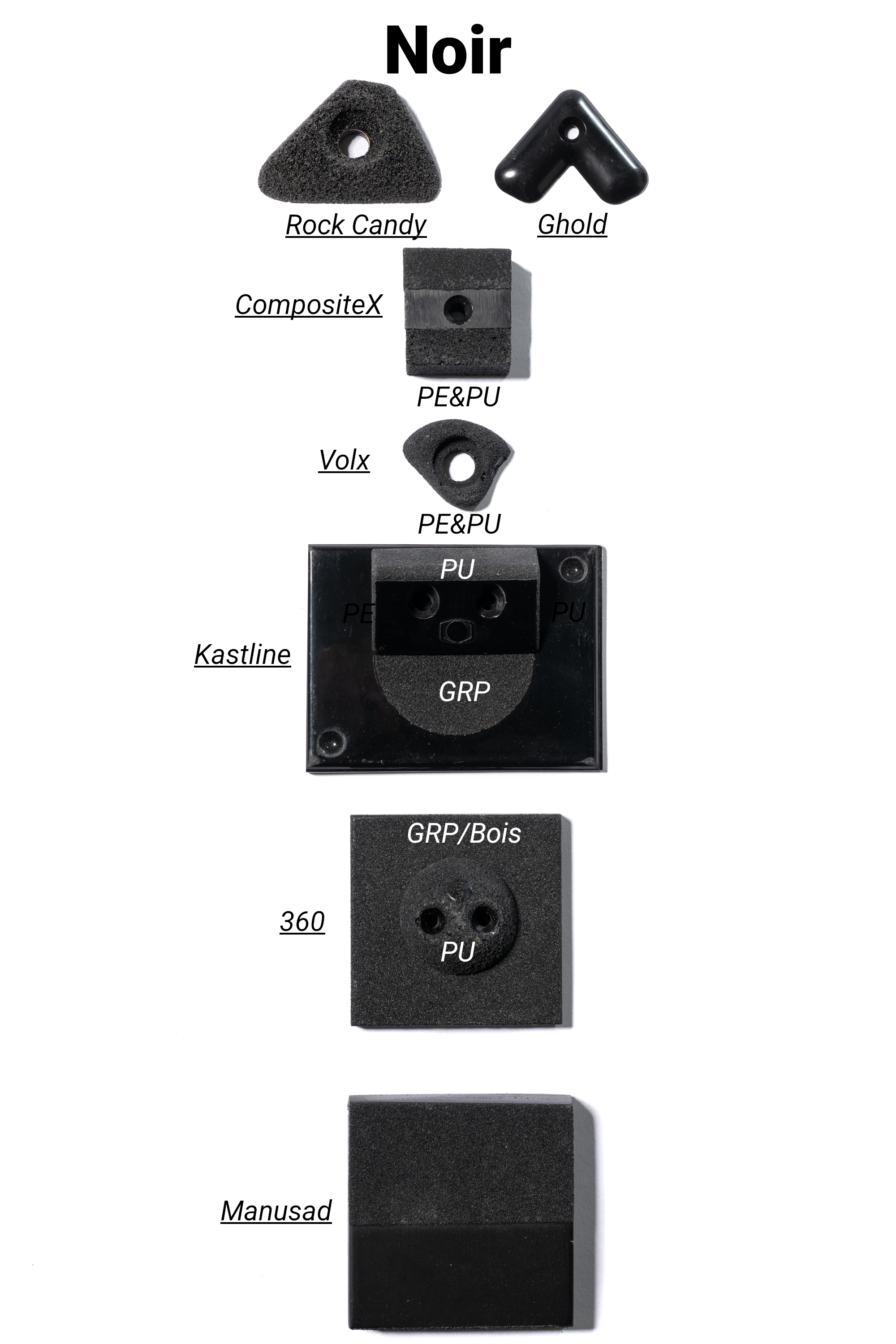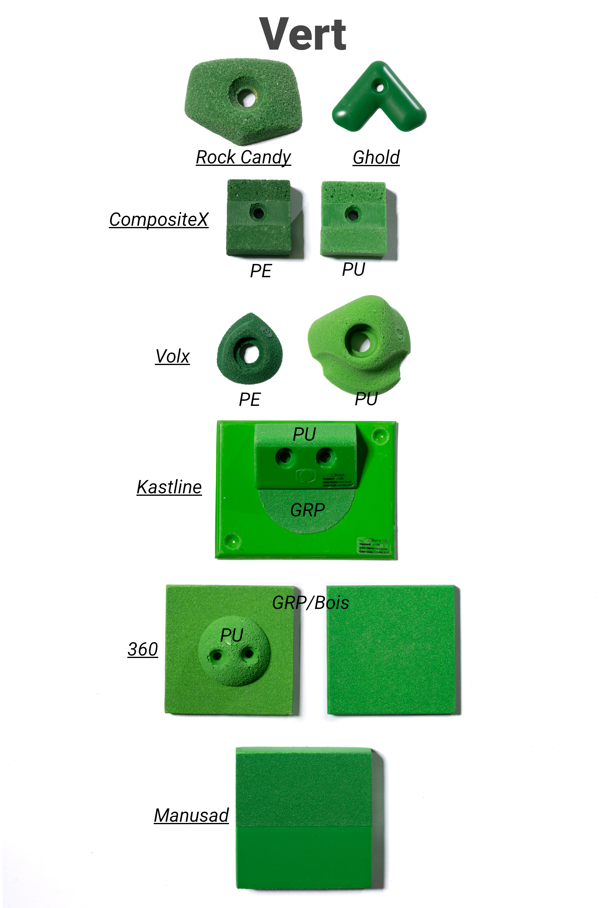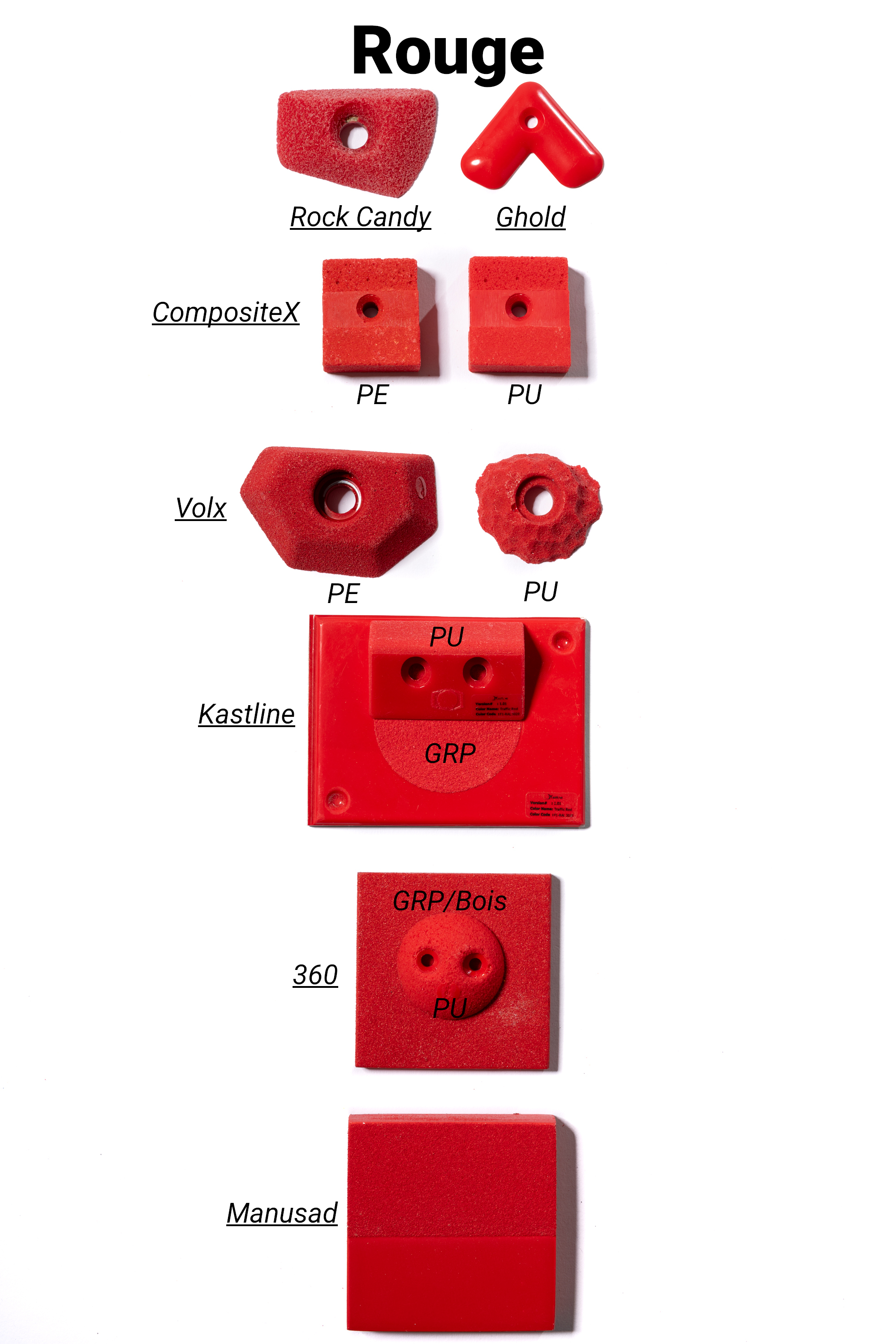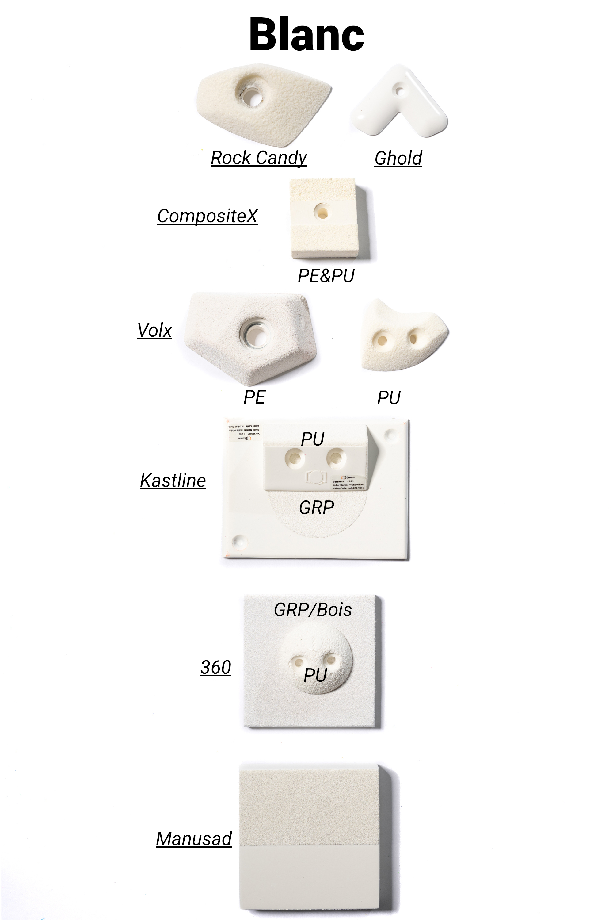 Les marques de prises et volumes d'escalade ont uniformisé leurs gammes de couleurs à la demande des salles qui cherchent à faire des itinéraires par couleur.