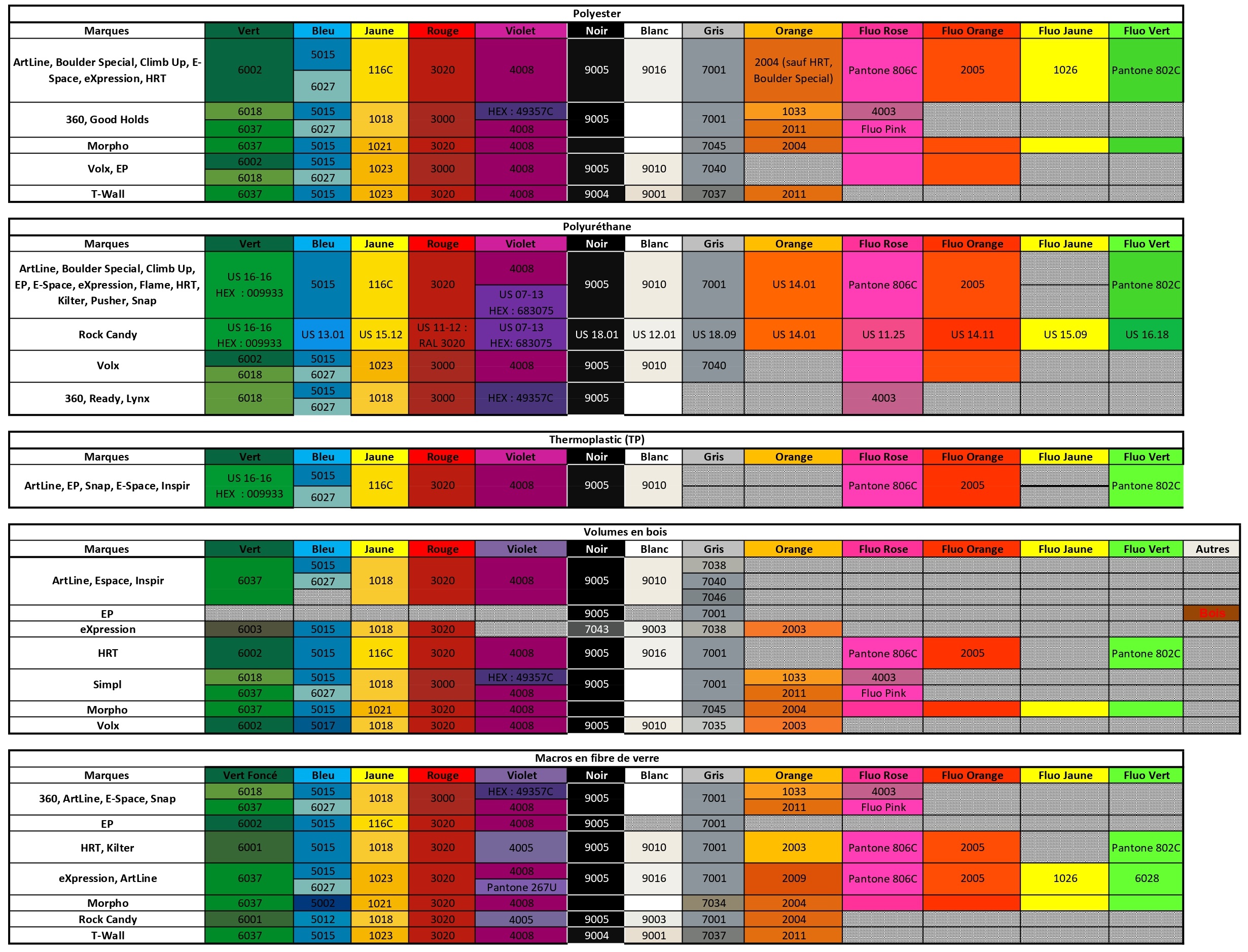 Pour vous y retrouver au mieux, voilà le tableau et les photos des correspondances par matériau et par marque. La codification des couleurs est principalement basée sur le système RAL (4 chiffres). Si ce n'est pas le cas, le code est précisé dans les nomenclatures suivantes :